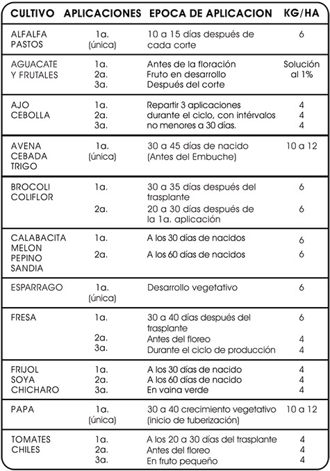 Garantizamos los porcentajes de los componentes indicados en las fórmulas. Debido a que el manejo y uso de nuestros productos está fuera de nuestro control, no nos hacemos responsables de los resultados que se obtengan, ya sea que se usen de acuerdo o no con las instrucciones. No se deben almacenar ni transportar junto a productos alimenticios, ropa o forrajes. Almacenar en lugar fresco y seco. No se dejen a la intemperie. Mantenerlos alejados de fuego y calor. Durante el manejo de nuestros productos, se deberá evitar la contaminación del aire, suelos, ríos, lagunas, arroyos, presas, canales o depósitos de agua, lavando o vertiendo en ellos residuos de nutrientes vegetales o envases vacíos. Maneje los envases vacíos y los residuos conforme a lo establecido en la Ley General para la Prevención y Gestión Integral de los Residuos. Al manejar nuestros productos, debe usarse la protección apropiada; ropa protectora, protección a los ojos y guantes de hule. No se debe comer, beber o fumar durante la preparación o aplicación. No deben hacerse soluciones directamente en los recipientes de los aspersores. Cuando los equipos hayan sido usados para aplicar herbicidas, lávense perfectamente antes de usarlos para aplicar fertilizantes foliares. En caso de ingestión, dé a beber cantidades considerables de agua. En caso de contacto con la piel, lave perfectamente el área afectada por lo menos durante 15 minutos con agua y jabón. En caso de contacto con los ojos, lave perfectamente con flujo suave de agua por lo menos durante 20 minutos. En caso de inhalación, retire al afectado al aire fresco. En caso de intoxicación, lleve al afectado con el médico y muestre la etiqueta.