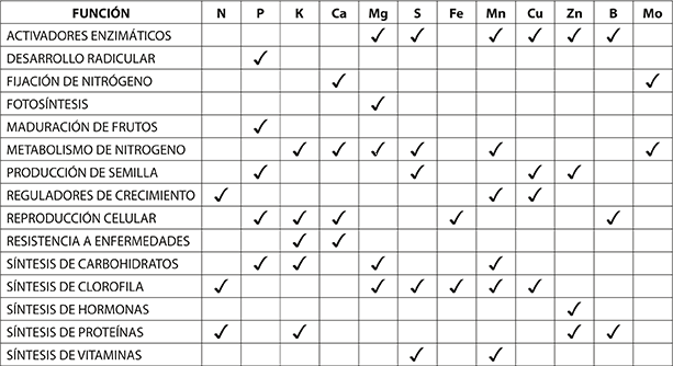 Cada uno de los elementos nutritivos esenciales, tiene funciones específicas en el ciclo vegetativo de las plantas.